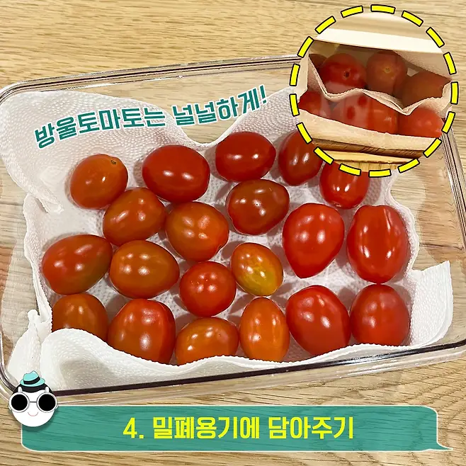 밀폐용기에 담아주기 전에 키친타올을 몇 장 깔아서 방울토마토를 넣어주세요. 이 땐 너무 방울토마토끼리 붙어있는 것보다 널널하게 두는 게 좋아요!