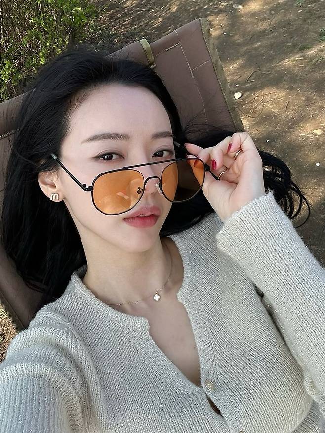사진 속 세리는 오렌지빛 렌즈가 돋보이는 선글라스를 착용한 채 자전거 위에 앉아 여유로운 미소를 지었다. 밝은 아이보리 톤의 니트 가디건과 와이드 팬츠의 조합은 군더더기 없는 실루엣을 자랑하며, 자연 속에서 더욱 빛을 발한다. 특히 선글라스의 컬러가 벚꽃 아래에서 따스하게 반사되어, 전체적인 무드를 더욱 포근하게 감싼다.