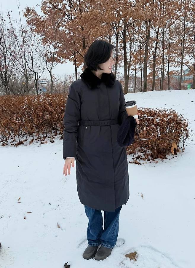 공개한 사진에서 정은채는 짧은 숏컷 헤어 스타일에 퍼 카라의 벨티드 롱 패딩 코트로 슬림하면서도 멋스러운 겨울 데일리룩으로 선보였다.