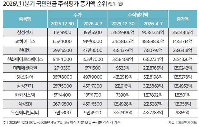 이런 주식평가액 급등에는 무엇보다 반도체 투 톱 삼성전자와 SK하이닉스가 절대적인 역할을 했다(표 참조). 국민연금이 보유한 삼성전자 지분율은 7.75%, SK하이닉스 지분율은 7.5%인데, 두 기업의 주가가 1분기 동안 각각 63.89%(11만9900→19만6500원), 40.71%(65만1000→91만6000원) 폭등하면서 주식평가 증가액이 35조1316억 원, 14조1714억 원을 기록했기 때문이다. 이는 국민연금의 1분기 전체 주식평가액 증가분에서 62.7%(49조3030억 원)를 차지하는 금액이다.현대차, 한화에어로스페이스, 미래에셋증권도 같은 기간 주식평가액이 급증했다. 국민연금이 7.31% 지분율을 보유한 현대차는 1월 세계 최대 정보기술·가전 박람회 'CES 2026'에서 휴머노이드 로봇 아틀라스 공개와 함께 로보틱스·피지컬AI(인공지능) 기업으로의 변신을 선언한 후 주가가 59.53%(29만6500→47만3000원) 급등하면서 주식평가액도 2조6418억 원 증가했다.