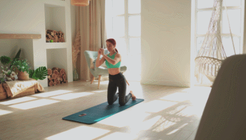 매트 위에 무릎을 꿇고 앉아서 시작합니다. 오른쪽 무릎을 세우면서 오른발을 매트 바닥에 단단히 붙입니다. 이어서 왼쪽 무릎도 세우면서 왼발을 매트 바닥에 붙입니다. 잠시 스쿼트 자세를 유지합니다. 다시 무릎을 내리면서 원래 자세로 돌아옵니다. 이 동작을 반복하세요.