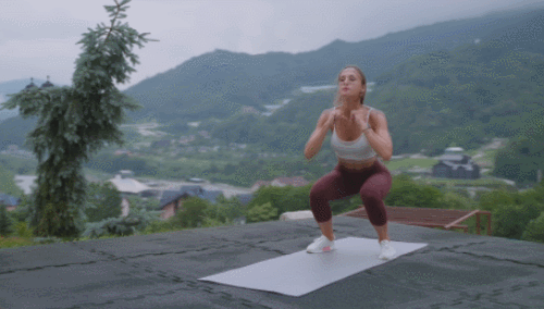 매트에 서서 다리를 어깨너비보다 넓게 벌립니다. 엉덩이를 내리면서 스쿼트를 진행합니다. 원래 자세로 돌아오면서 왼발을 앞으로 뻗습니다. 다시 스쿼트 동작을 한 후, 오른발을 앞으로 뻗습니다.