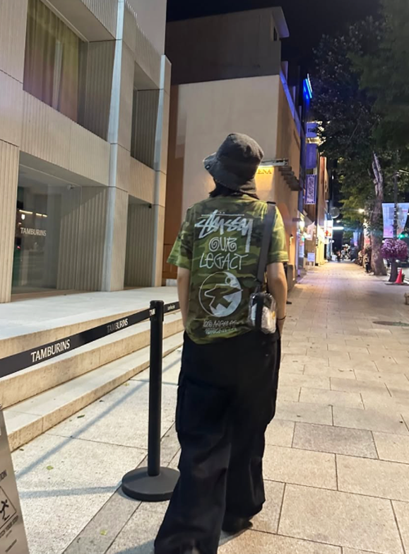 특히 등판에 ‘STÜSSY’ 로고와 타이포그래피 디자인이 크게 새겨진 카키 계열의 티셔츠는 시선을 사로잡는다.