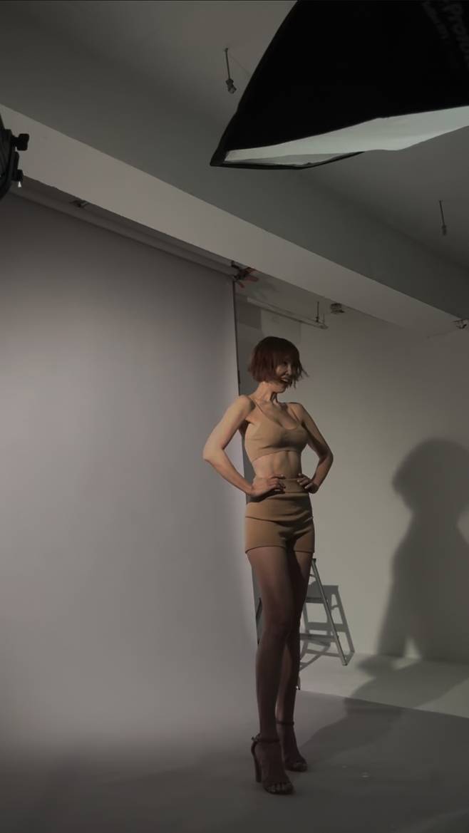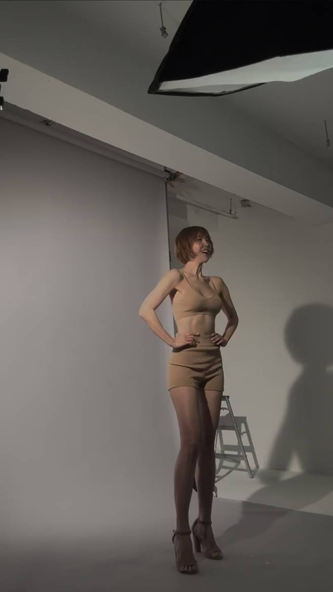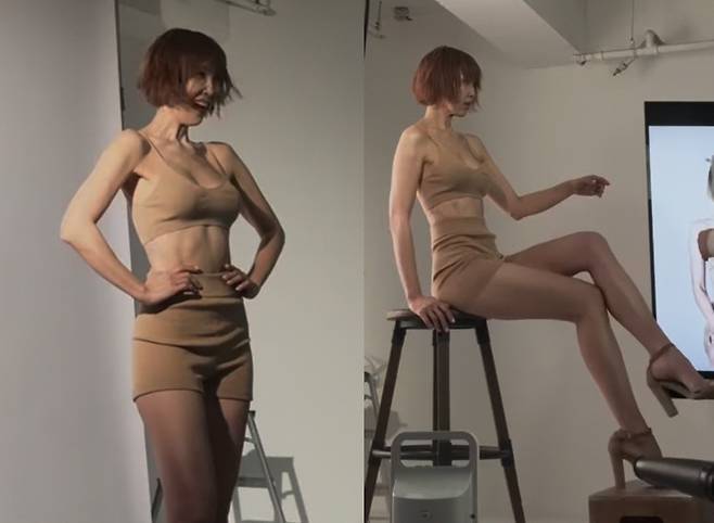 최은경은 누드톤의 브라탑과 쇼츠를 입고 완벽한 보디라인을 과시하며 프로페셔널한 포즈를 선보였습니다.