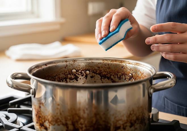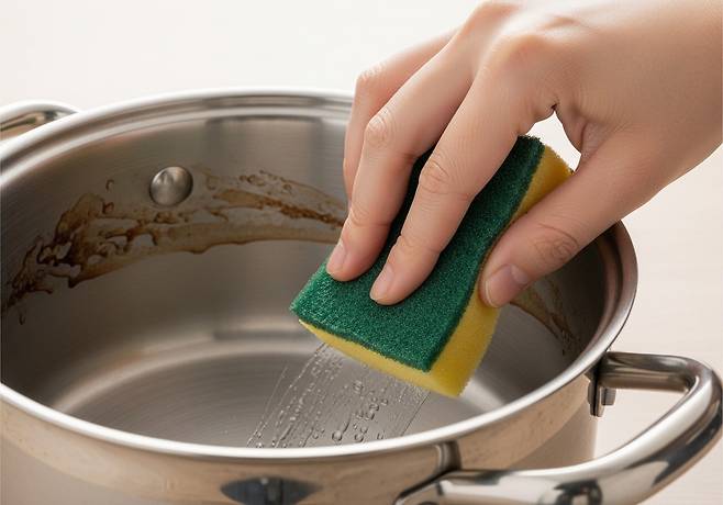 끓인 뒤 식힌 상태에서 수세미로 닦으면 얼룩이 훨씬 쉽게 제거됩니다. 억지로 긁지 않아도 자연스럽게 떨어집니다.