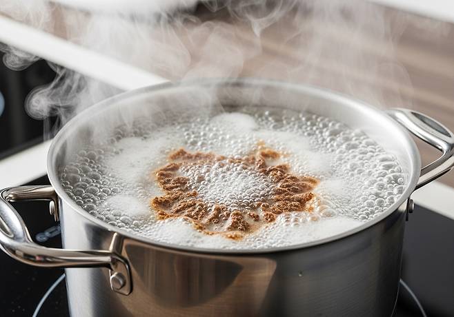 냄비에 물을 붓고 식초를 조금 넣은 뒤 끓여주면 얼룩이 서서히 풀리기 시작합니다.