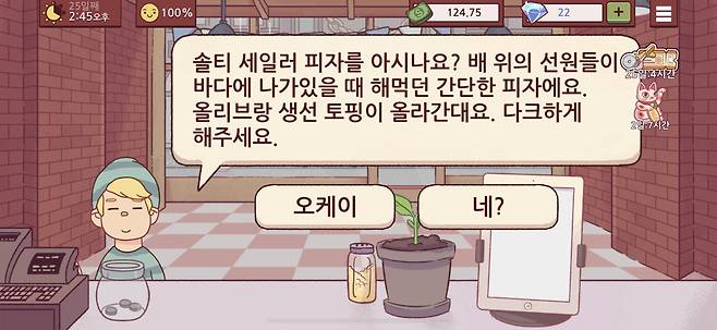 게임을 시작하면 유저는 이미 지역에서 장사가 잘되는 피자집 ‘알리칸테’ 앞에 굳이 또 피자집을 개업한 주인이 된다. 온라인상에선 스타벅스나 써브웨이 등 메뉴의 커스텀이 가능한 곳에서의 주문을 어려워하는 사람들, 또 상세한 커스텀을 거침없이 소화하는 직원의 능숙함이 ‘밈’화되어 유머로 통하는데, <좋피위피>의 손님들은 엄청나게 복잡한 메뉴를 당당하게 주문한다. 칭송받는 밈 속의 직원처럼 피자를 완벽하게 만들기까지는 얼마간의 시간이 필요하다. 처음에는 페퍼로니 피자처럼 우리에게 익숙하면서도 단순한 메뉴 주문이 들어오는데, 점점 난이도가 높아진다. 유저의 곤란함은 아랑곳하지 않는다. “페퍼로니 없는 페피로니 피자 주세요.”처럼 언어유희에 가까운 주문부터 현실에서 피자를 주문할 때 한 번도 생각한 적 없던, 멸치나 가지 같은 재료의 요청이 들어온다. 피자를 판매한 돈으로 재료 슬롯을 하나씩 열어야 한다.