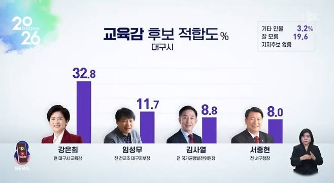 | ▲ 대구시장 선거를 앞두고 지역 민영방송인 TBC가 여론조사기관 리얼미터에 의뢰해 지난 28일과 29일 대구시민 804명을 대상으로 차기 대구시장 후보 적합도를 조사했다. |