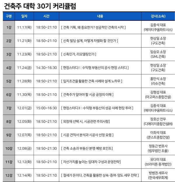 이번 과정에서는 건축비 상승과 고금리를 이겨내는 수익형 빌딩 건축 노하우를 집중적으로 다룬다. 건축에 나서기 전 건축주가 반드시 알아야 할 설계 전략, 건축비 산정 방법, 시공 견적서 보는 법, 임대차 및 건축과 관련한 상속·증여 노하우 등을 전한다.