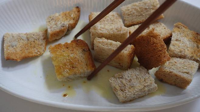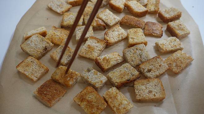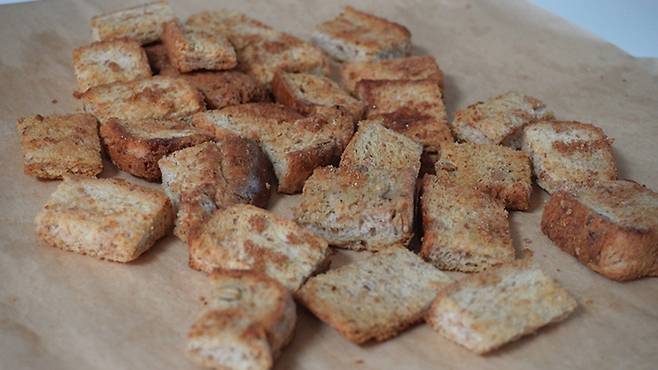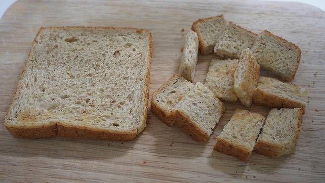 남아서 딱딱해진 식빵이나 식빵 자투리를 준비합니다. 먹기 좋은 크기인 2cm 정도의 큐브 모양이나 긴 스틱 모양으로 일정하게 잘라주세요. 잘 안 먹는 식빵 끝부분만으로 만들어도 좋습니다.