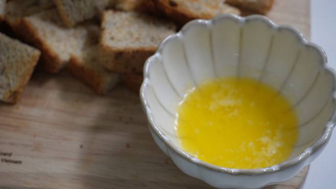 넓은 볼에 잘라둔 식빵을 담고 녹인 버터를 조금씩 나누어 부으며 골고루 버무려줍니다. 그릇을 가볍게 흔들어 빵 표면에 버터가 얇고 고르게 스며들도록 해 주세요.
