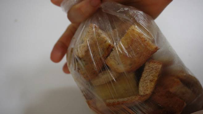에어프라이어나 오븐을 170도 전후로 예열합니다. 종이 호일을 깐 트레이 위에 봉지 안의 식빵을 쏟아붓고, 서로 겹치지 않게 최대한 넓게 펼쳐주어야 수분이 잘 날아가서 눅눅해지지 않습니다.