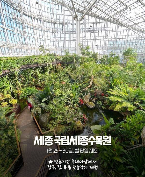 국립세종수목원은 설 연휴기간 1월 25일부터 30일까지 무료로 개방되며, 설 당일인 1월 29일 목요일은 휴관합니다. 연휴기간 축제마당에서 장구, 징, 북 등 전통악기 체험을 해볼 수 있는데요. 27일 수요일을 제외하고는 이야기가 있는 스탬프투어 및 교육 부스를 함께 즐길 수 있습니다.