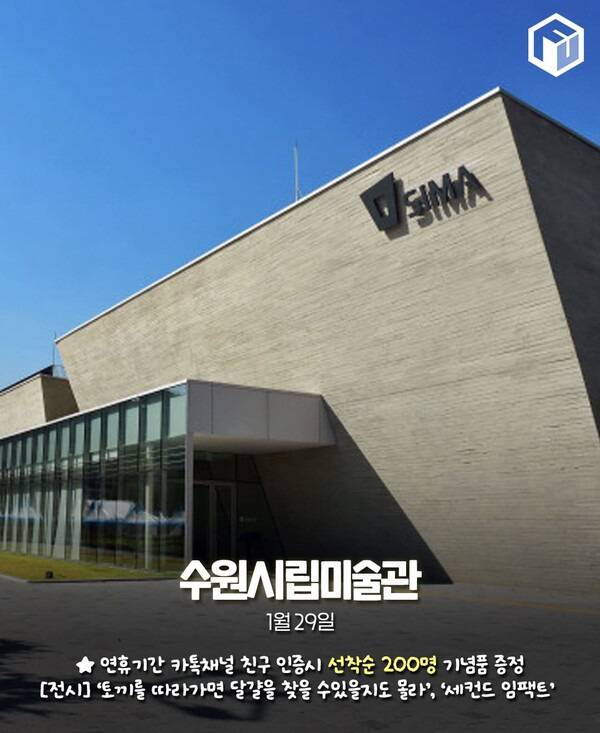 수원 화성행궁 옆에 위치한 수원시림미술관은 설 당일인 1월 29일 무료입장을 실시합니다. 연휴기간 카톡채널 친구 인증시, 선착순 200명의 관람객은 기념품을 받을 수 있습니다.