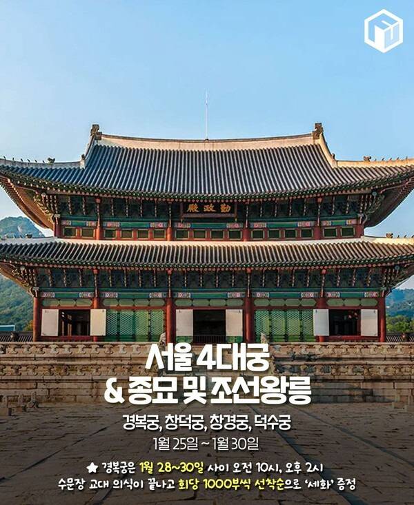 1월 25일부터 30일까지 설 연휴 6일간 서울 4대 궁궐과 종묘, 조선왕릉 등 22곳은 휴무일 없이 무료로 개방됩니다. 특히 종묘는 평소 예약제로 운영되던 곳이지만, 연휴 기간에는 예약 없이도 자유롭게 관람이 가능합니다.