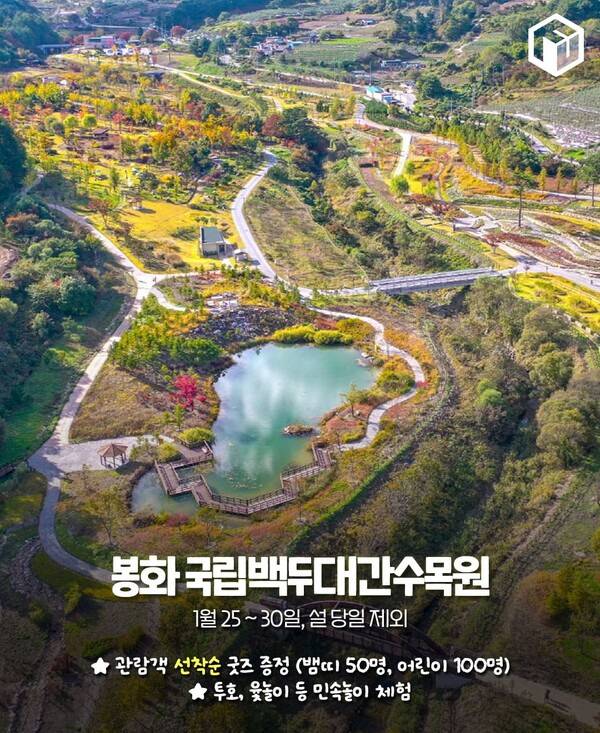 경북 봉화 국립백두대간수목원도 1월 25일부터 30일까지 무료 개방되며, 설 당일인 1월 29일 목요일은 휴관입니다. 연휴기간 뱀띠 관람객 50명, 어린이 관람객 100명에게는 선착순으로 굿즈가 증정되는데요. 수목원 내 투호, 윷놀이 등 민속놀이 체험장이 마련되기도 합니다.