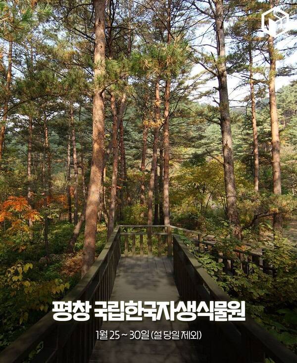 푸른 숲 속 산책로가 조성되어 있는 평창 국랩한국자생식물원은 설 연휴 기간 1월 25일부터 30일까지 무료로 개방됩니다. 설 당일인 1월 29일은 제외이니 방문시 참고하시면 되겠습니다.