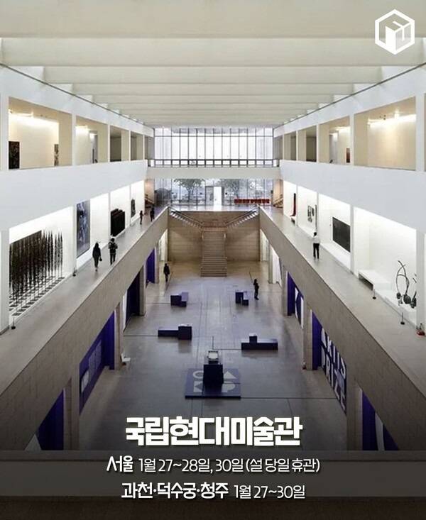 국립현대미술관은 2025 설 연휴기간 서울, 과천, 덕수궁, 청주관을 무료로 개방합니다. 서울 국립현대미술관은 설 당일인 1월 29일 수요일에는 휴관합니다.
