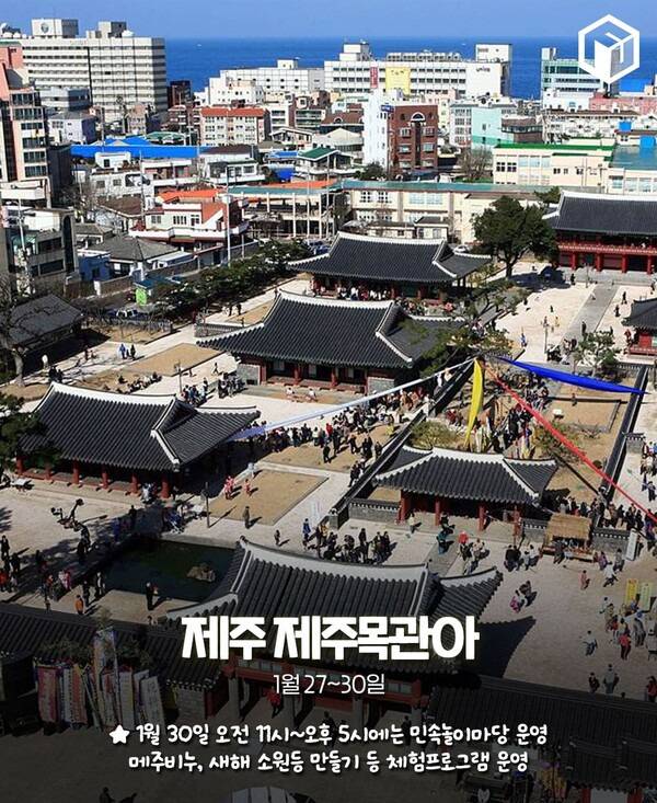 제주도의 제주목 관아는 1월 27일부터 30일까지 무료 입장이 가능합니다. 특히 1월 30일 오전 11시부터 오후 5시까지는 민속놀이마당이 운영되어 딱지치기, 윷놀이 등 10종 전통 민속놀이를 즐길 수 있습니다. 메주비누, 새해 소원등 만들기와 같은 체험프로그램도 마련됩니다.
