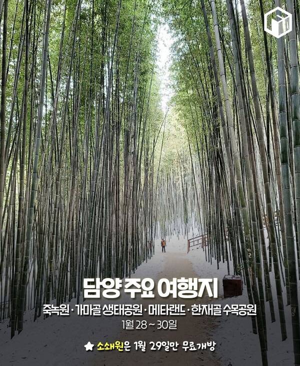 담양군은 설 연휴기간 주요 여행지를 무료로 개방합니다. 죽녹원, 가마골 생태공원, 메타랜드, 한재골 수목원은 1월 28일부터 30일까지 3일간 무료로 개방됩니다. 담양 소쇄원은 설 당일인 1월 29일 목요일 단 하루만 무료로 개방됩니다.