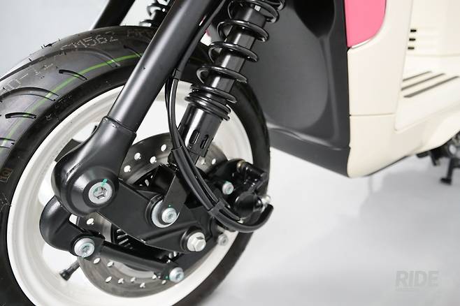 브레이크는 앞뒤 모두 디스크 방식이며, 2채널 ABS가 더해져 안정적인 제동력을 제공한다. 귀여운 외모에 콤팩트한 사이즈지만 2채널 ABS가 장착된 것은 그만큼 제동력에 신경썼다는 의미이기도 하지만 우리나라에서 많이 판매하기 위해서는 그만큼 스펙에 신경을 써야 한다는 사실을 말해주는 부분이기도 하다. 특히 브레이크 같은 부분이 더욱 그런데 예전처럼 디자인이 귀엽다고 성능은 고만고만하면 판매하기 어려운 것이 현실이다.