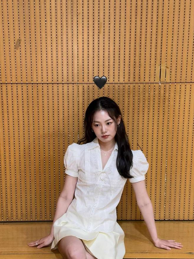 하의로는 허벅지 중간까지 오는 밝은 톤의 미니 플레어 스커트를 선택해 발랄함을 더했다. 스커트의 부드러운 실루엣이 블라우스와 조화를 이루며, 움직일 때마다 자연스럽게 퍼지는 라인이 경쾌함을 더한다.