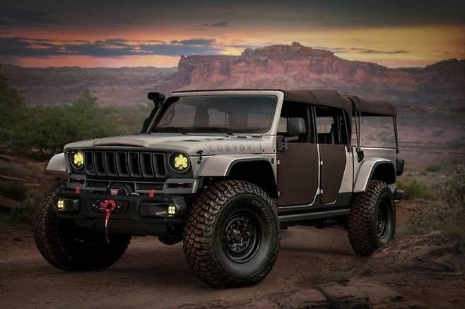 지프 콘보이 콘셉트(Jeep Convoy Concept): 2025 지프 글래디에이터 모하브를 기반으로 1960~80년대 J-시리즈 트럭의 유산을 현대적으로 재해석한 밀리터리 감성의 오프로드 픽업입니다. 고스트 옵스 무광 외장 컬러, J-트럭 스타일 후드와 그릴, 1만2,000파운드 윈치, 앰버 LED 내장 세븐 슬롯 그릴, 초콜릿 브라운 캔버스 도어·탑, 40인치 오프로더 타이어 등으로 강인한 이미지를 강조했습니다. 실내는 밀스펙 올리브 그린 코팅 바닥과 빈티지 가죽 시트를 적용하여 전천후 장거리 오프로드 주행에 최적화되었습니다.