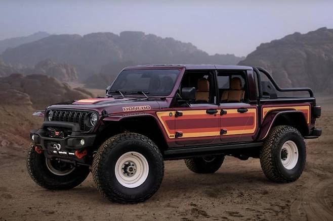 7. 지프 J6 혼초 콘셉트(Jeep J6 Honcho Concept): 1970년대 후반 혼초 테마를 기반으로, 지프 루비콘 4도어를 2도어 픽업트럭 형태로 개조한 모델입니다. 기존 글래디에이터보다 12인치 긴 6피트 적재함을 갖춰 적재 능력을 극대화했습니다. 전체 길이 201인치, 휠베이스는 118.4인치로 현행 4도어 랭글러와 동일합니다. 외관은 2인치 리프트킷, 브론즈 휠, 37인치 머드 타이어, 커스텀 롤바 및 스페어타이어 캐리어, 빈티지 배지 등으로 오프로드 감성을 강화했습니다. 실내는 블루 스티치 포인트, 라디오 삭제, 브론즈 페인트 트림으로 클래식 분위기를 연출했습니다.