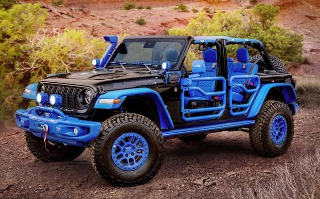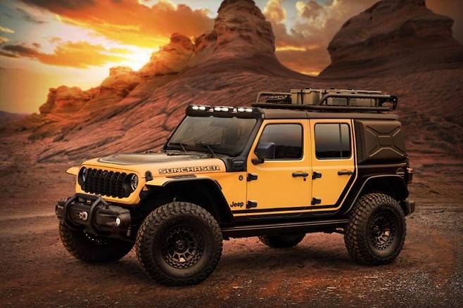 5. 지프 랭글러 4xe 선체이서 콘셉트(Jeep Wrangler 4xe Sunchaser Concept): 일출부터 일몰까지 야외 활동에 최적화된 올인원 오프로더로, 솔라 플래시와 새틴 블랙 투톤 외관으로 강렬한 존재감을 드러냅니다. 2인치 리프트킷, 회전식 오프로드 라이트 바, 통풍 스틸 펜더, MOLLE 패널 일체형 측면 수납박스, 루프랙, 윈치 가드 등을 갖추고 37인치 머드 타이어로 주행 성능을 극대화했습니다. 실내는 투톤 가죽 시트와 글로스 블랙 트림, 올웨더 매트, 멀티 액세서리 레일 등으로 실용성과 감성을 모두 챙겼습니다.