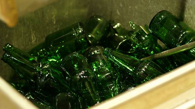 그러니까 처음부터 소주병이 초록색이었던 건 아니다. 옛날 소주는 제각기 다 다른 색, 다른 모양이었는데, 2009년 소주 제조업계와 환경부가 소주 공병 공용화 자율협약을 맺으며 병을 통일하게 된 거다.