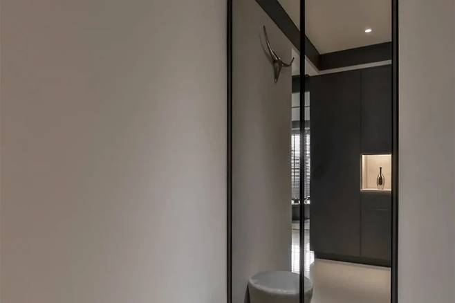 방문을 열고 들어가면 가장 먼저 차분한 회색 톤과 세심한 디테일의 조화가 인상적이다. 오른쪽 벽에는 전신 거울과 함께 공간을 넓어 보이게 하는 문 형태의 신발 수납장이 배치되어 있어 깔끔한 분위기를 자아낸다.