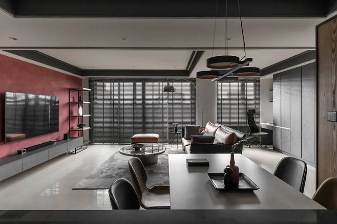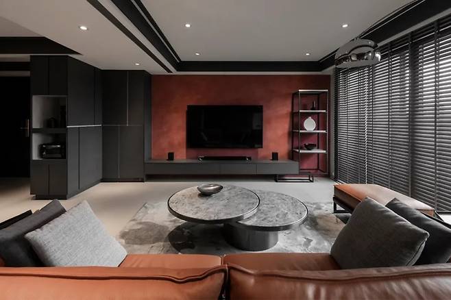 러시아산 미네랄 코팅으로 마감된 TV 벽은 짙은 블랙 톤에 붉은 색조가 더해져 자연광과 조화를 이루며 다양한 분위기를 연출한다. 떠 있는 듯한 하부 수납장과 철제 선반은 공간을 넓어 보이게 하고 시각적 즐거움을 제공한다.