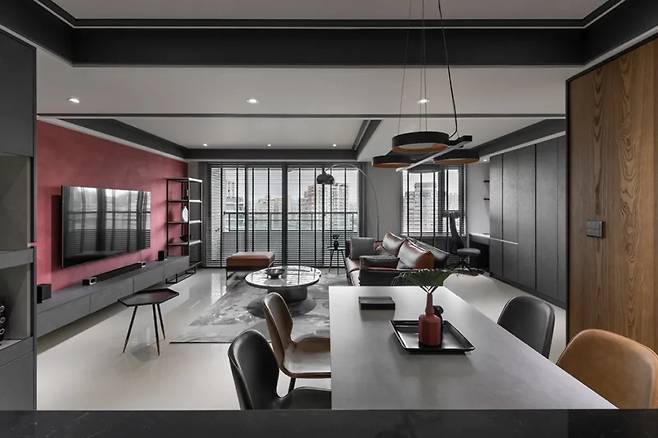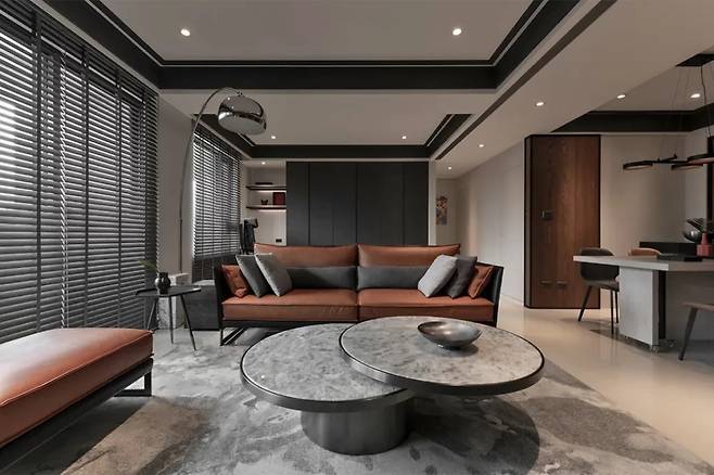 거실은 창밖의 도시 풍경이 실내로 자연스럽게 흐르도록 설계되었으며, 가구, 조명, 색상 모두 빈틈없이 세심하게 완성되어 있다. 고정된 벽과 바닥 대신 천장의 입체적 디자인이 시선을 끌어당긴다.