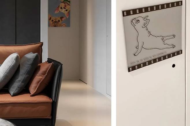 복도 끝에는 반려견을 위한 일러스트가 장식되어 있다. 세 개의 문은 존재감을 줄이기 위해 은은한 색으로 처리되었으며, 손잡이 대신 투명한 아크릴 사각 손잡이를 사용해 디자인의 일관성을 유지했다. 이러한 세심한 디자인 덕분에 빈번히 이동하는 구역임에도 깔끔함을 유지한다.