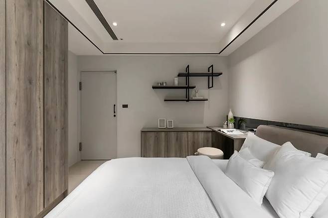 게스트룸 겸 부모님이 머물 수 있는 공간은 밝고 차분한 톤으로 마감되어 안정감을 준다. 벽에 일체형으로 설치된 책상과 철제 오픈 수납은 깔끔하게 정돈된 인상을 주며, 길게 배치된 블랙 미러는 포인트 역할을 하면서 철제 요소와 통일감을 준다. 불필요한 장식을 배제하고 본연의 기능에 충실한 구성이 이 공간의 특징이다.