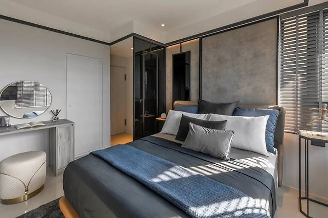 고급스러운 블랙 유리와 금속 프레임으로 구분된 작은 현관을 지나 침실에 들어서면, 헤드보드 벽 전체가 메탈릭한 질감과 조명으로 연출되어 있다. 목재 블라인드를 통해 들어오는 자연광은 침실을 부드럽게 감싸며 편안함과 세련미가 공존하는 공간을 만들어낸다.