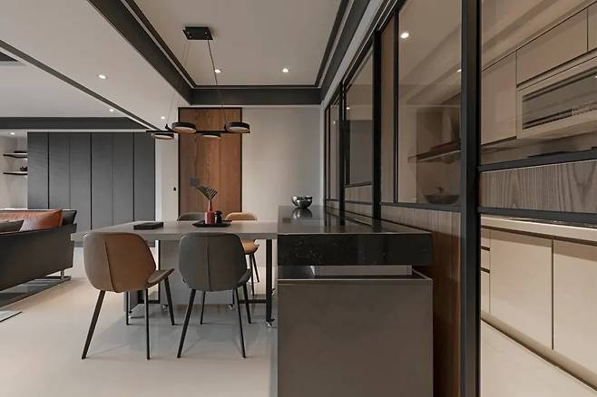 주방은 반투명 유리와 우드 소재의 슬라이딩 도어로 수납과 개방감을 동시에 갖추었다. 중앙의 아일랜드는 조리대이자 식탁으로 사용 가능하며, 블랙 실리카 스톤 상판에 설치된 IH 인덕션은 조리 후 청소를 용이하게 한다.