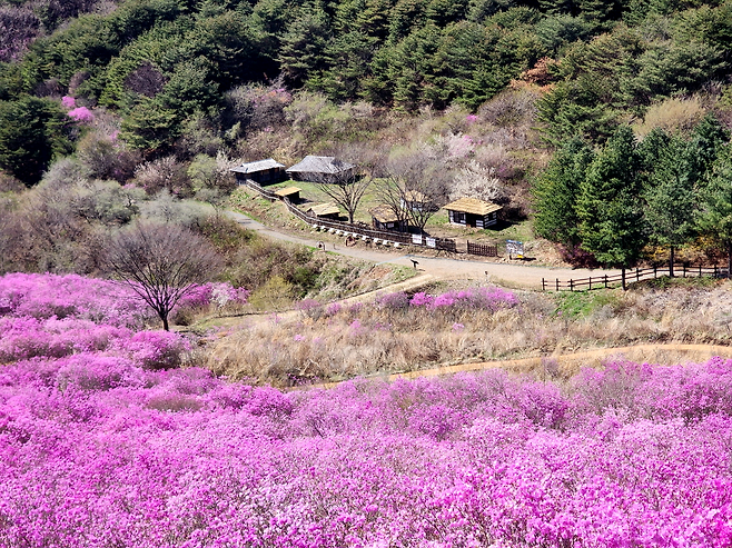 진달래 군락지 초입에 자리한 허준 드라마 세트장은 그 자체로 고즈넉한 멋을 풍깁니다. 현재 세트장 주변에는 매화꽃이 한창이며, 세트장에서 군락지로 들어서는 길목은 이미 꽃들이 흐드러지게 피어있어 완벽한 포토존이 되어줍니다. 고풍스러운 초가집과 진분홍 진달래가 어우러진 모습은 마치 시간을 되돌린 듯한 신비로움을 줍니다.