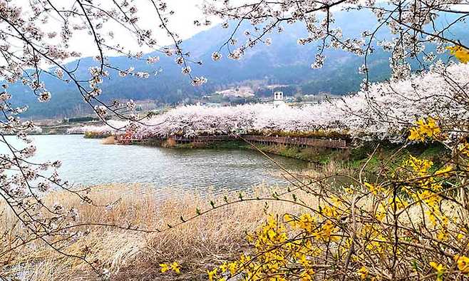송월마을은 정겨운 시골 마을에서 봄꽃을 감상할 수 있는 곳인데요. 저수지의 고요한 풍경과 벚꽃이 더해져 그림 같은 모습을 자아내죠.