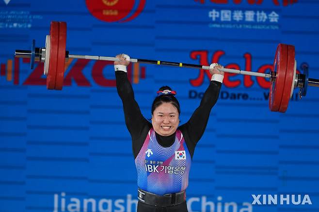 [장산=신화/뉴시스] 김수현이 13일(현지 시간) 중국 저장성 장산에서 열린 2025 아시아역도선수권대회 여자 76㎏급 경기를 펼치고 있다. 김수현은 인상 100㎏, 용상 134㎏, 합계 234㎏을 들어 올려 합계 3위(인상 3위, 용상 2위)를 기록했다. 아시아역도선수권대회는 인상, 용상, 합계 세 부문에서 각각 메달이 수여돼 김수현은 은메달 1개, 동메달 2개를 수확했다. 2025.05.14.