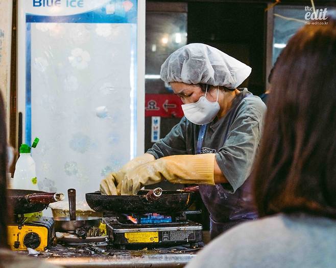 점심 피크 타임이 살짝 지난 월요일 오후 1시 반에 도착했지만 웨이팅은 피할 수 없었다. 내 앞에는 스무 명 넘는 사람들이 대기 중이었고, 35분 정도 기다린 끝에 입장했다. 좌석은 주방을 ‘ㄷ’자로 둘러싼 바 좌석과 식당 내부의 테이블 석으로 나뉜다. 나는 시장 분위기를 더 가까이 느끼기 위해 바 자리에 앉았다. 외국인 관광객, 대학생 커플, 노부부 할 것 없이 다양한 사람들이 뽀얀 김이 피어오르는 가마솥을 가운데 두고 낡은 식탁에 빼곡히 앉은 풍경이 낯설고도 정겹다.