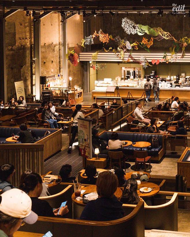 스타벅스 경동시장1960점은 시장 안 28년간 방치된 폐극장을 개조해 탄생했다. 높은 층고와 어둑한 조명으로 극장의 분위기를 그대로 살렸다. 좌석은 계단식으로 층층이 배치되어 시야가 탁 트인다. 서울에서 보기 힘든 대형 카페처럼. 계단 아래를 내려다보는 구조 덕분에 개방감이 느껴지고, 맨 위층에 앉으면 300평 넘는 공간을 한 눈에 담을 수 있다. 규모는 웅장하지만 은은한 조도와 적절히 분리된 좌석 덕분에 의외로 아늑한 느낌을 준다.