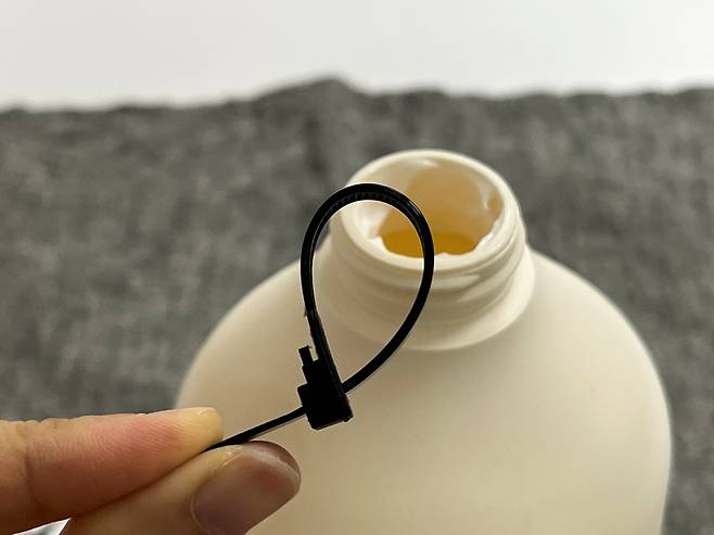 케이블 타이를 강하게 당겨 비닐을 로션 입구에 단단히 고정해 주세요.