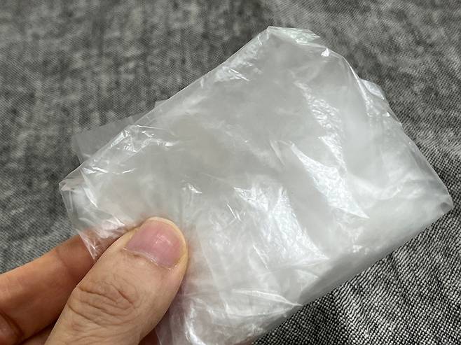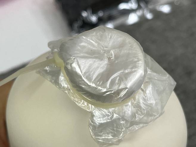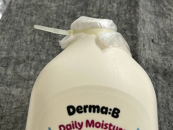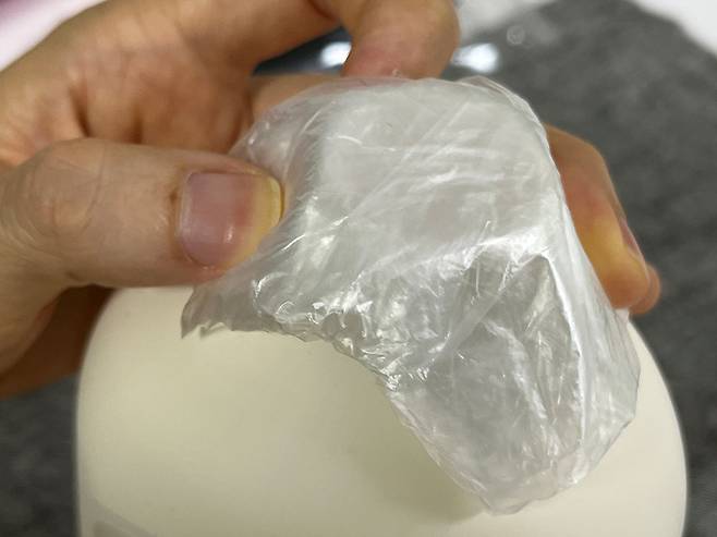 작은 사이즈의 위생 비닐은 여러 겹으로 접은 후 로션 입구에 대 줍니다.