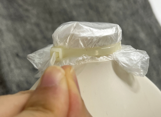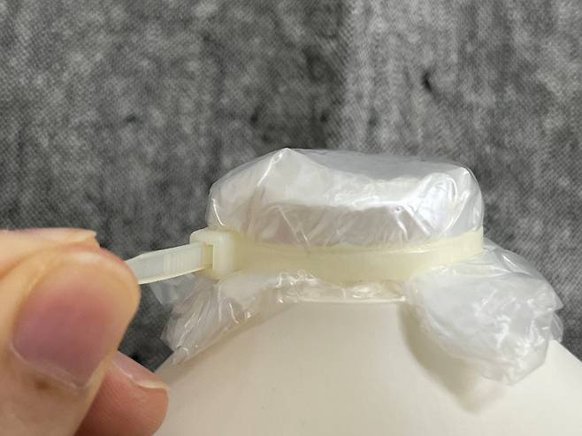 위생 비닐이 입구 쪽에 들뜸 없이 붙도록 한 후 케이블 타이로 고정시켜 주세요.