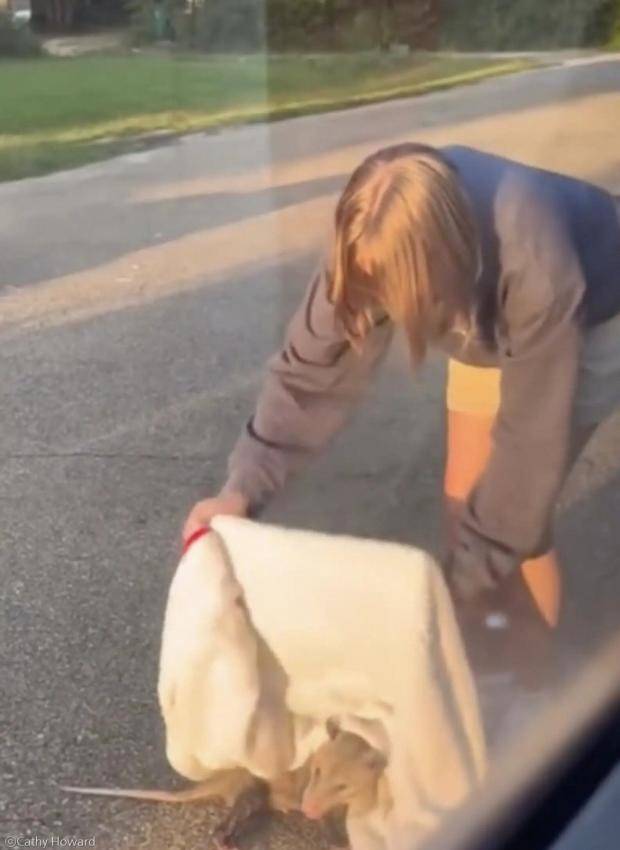 주머니쥐를 돕기로 결심한 소녀는 담요를 사용해 녀석을 붙잡은 후 차에 태웠다. 녀석은 소녀가 안자마자 진정한 듯 보였다.