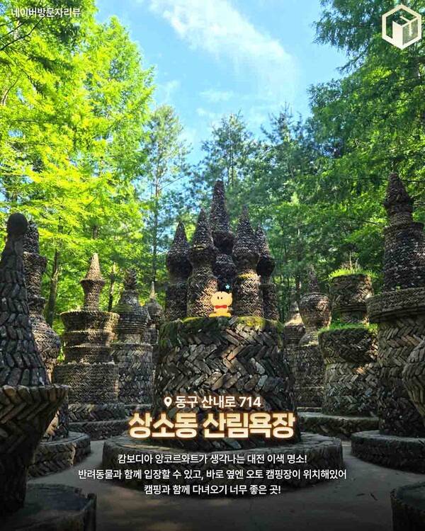 대전에서 만날 수 있는 가장 이색적인 풍경일 상소동 산림욕장 또한 추천 대전 여행지인데요. 앙코르와트를 닮은 돌탑들이 울창한 숲 사이에 줄지어 서 있는데, 그 자체로도 정말 멋진 포토존을 만날 수 있는 이색 대전 여행지입니다.