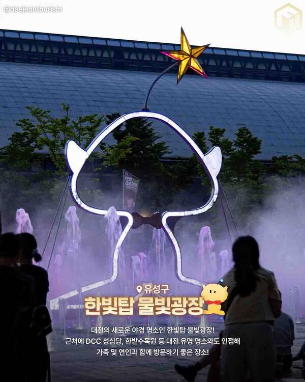 해가 지고 어스름한 저녁이 되면, 이곳은 조명이 반짝이고 음악에 맞춰 분수가 리듬을 타는 낭만적인 공간으로 변신하는 대전 가볼만한 곳인데요. 특히 한빛탑 조형물은 마치 우주정거장처럼 반짝여서 눈을 뗄 수 없더라고요.