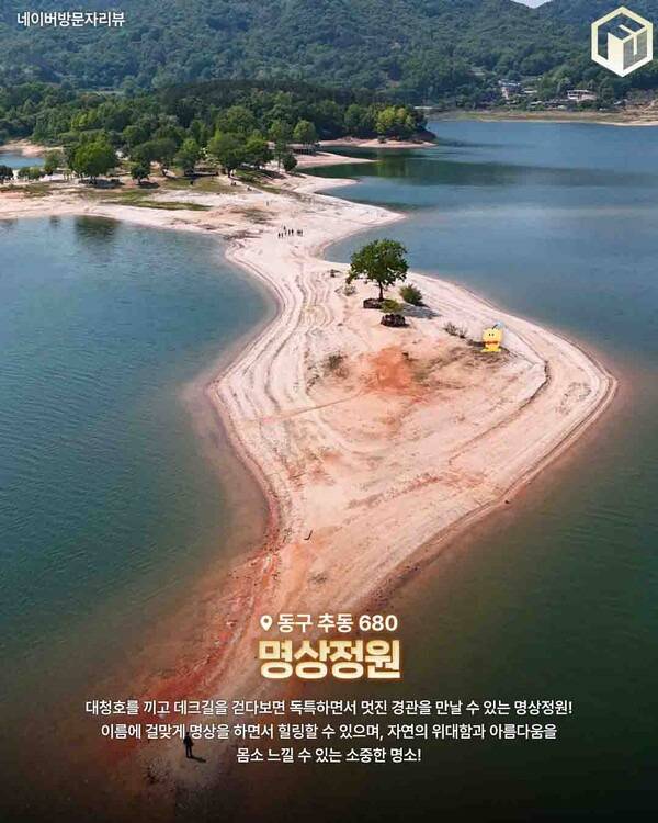 마지막으로 추천드리는 대전 여행지, 바로 명상정원입니다. 대청호를 따라 조용히 걷다 보면 만날 수 있는 명상정원인데요. 이곳은 마치 호수 위에 펼쳐진 길을 걷는 듯한 느낌을 받을 수 있는 대전 가볼만한 곳 1위로 뽑히는 곳입니다.