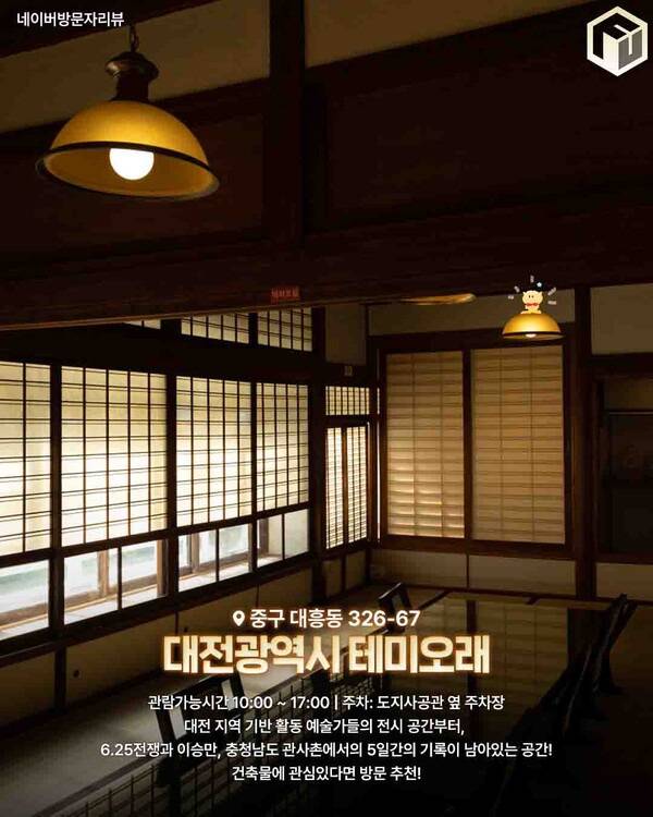대전 대흥동에 위치한 이곳은 옛 관사촌을 리모델링한 전시 공간인데, 일본식 목조건물 특유의 정갈함과 여유가 그대로 느껴지는 대전 이색 여행지입니다. 전쟁기록부터 지역 예술가 전시까지, 사색하며 둘러보기 좋고 특히 오후 시간 햇살이 들어오는 창가가 너무 예뻐 인생샷 남길 수 있는 아름다운 대전 여행지입니다.